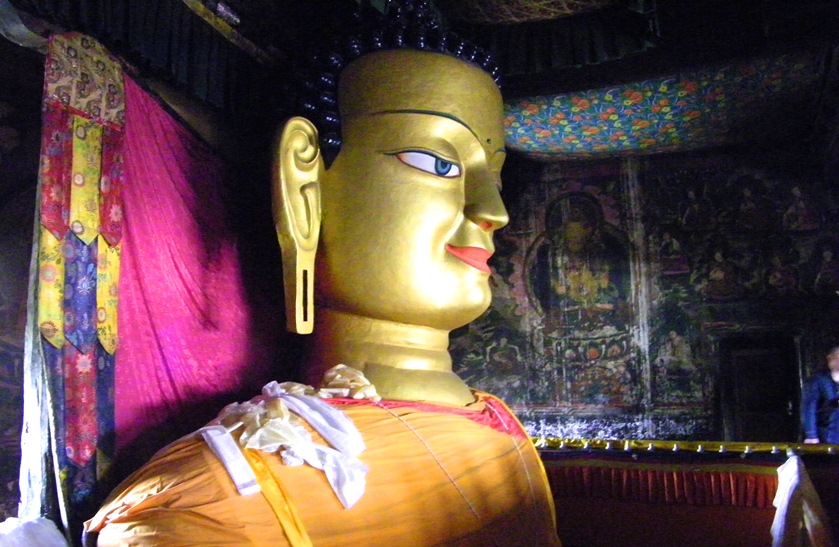Shakyamuni Buddha statue made of copper and guilded gold, inside Shey Palace. The status is 12 metres tall and stretches across 3 floors.