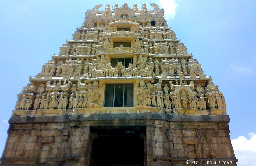 The main entrance to the Chennakesava temple complex in Belur is crowned by an ornate gopuram or tower, built in the Vijayanagara style